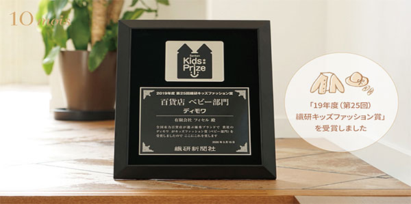 | ファッション業界の専門誌、繊研新聞社が発表している 「19年度(第25回)繊研キッズファッション賞」の「ベビー部門」に10mois(ディモワ)が受賞しました。10moisがこのように評価いただけることに大変光栄に思っております。今後もたくさんの方に愛されるブランドとなれるよう、スタッフ一丸となって取り組んでまいりますので、よろしくお願いいたします。 |