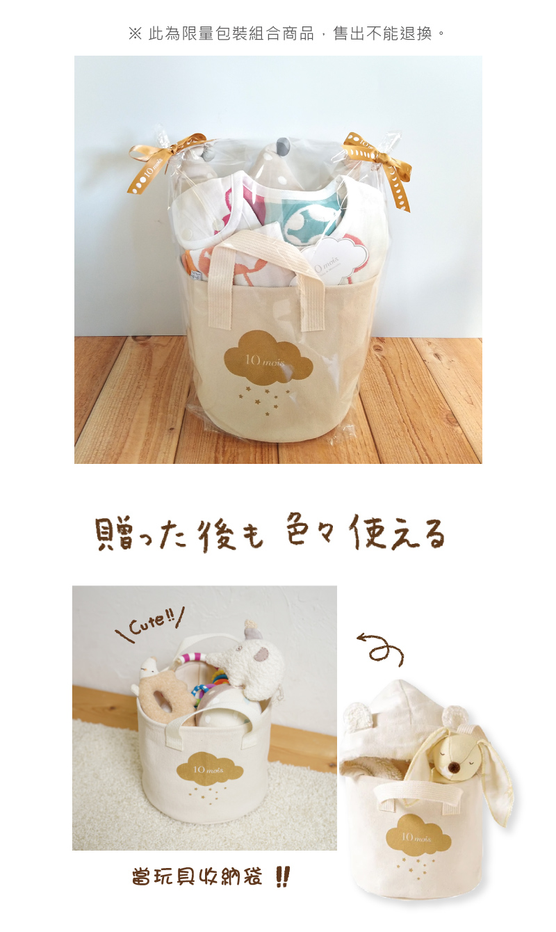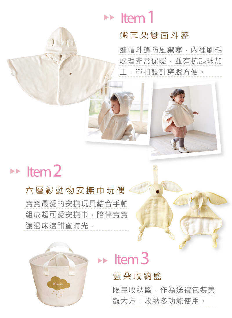 斗篷:100%棉(有機棉)|安撫玩偶:表布:100%棉(部份有機棉)、填充物:100%聚酯纖維