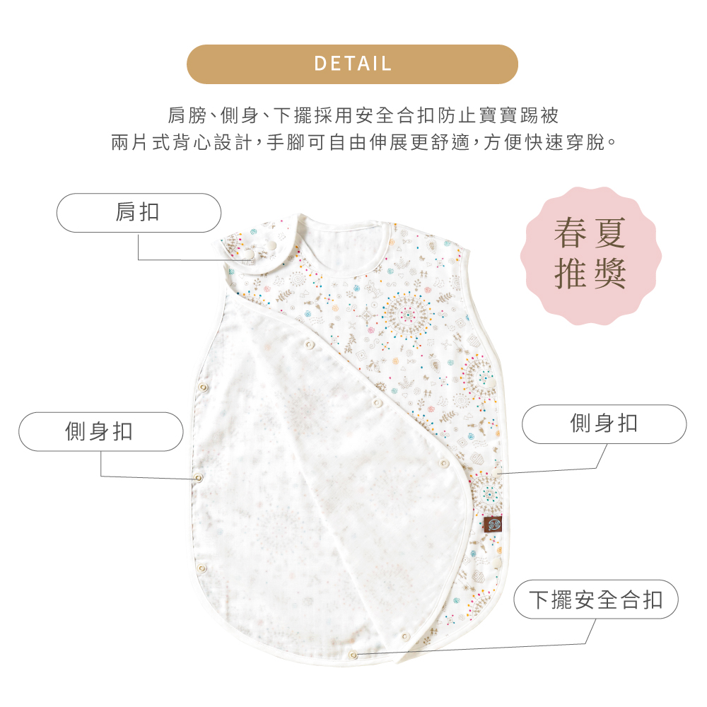 - 背心造型就算寶寶睡眠時怎麼翻滾也不怕踢被不著涼