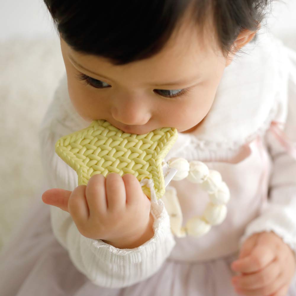柔軟有彈性的矽膠,表面如毛線編織般的凹凸設計,舒緩寶寶長牙初期牙齦癢癢的不適感,也能作為練習咀嚼的工具,為日後的離乳食做好準備。貼心附有扣環夾,可固定在圍兜或衣物上,不怕掉落或遺失。