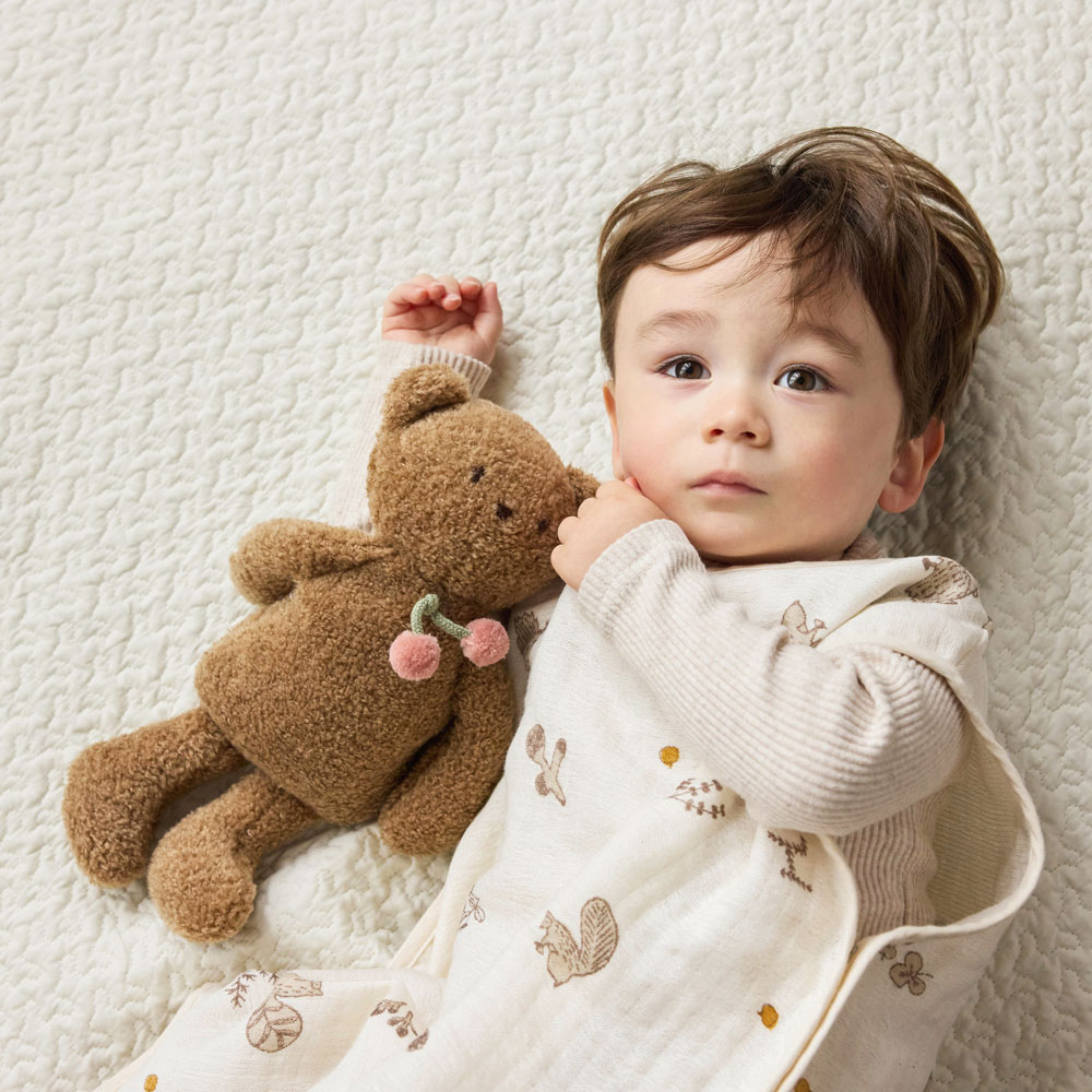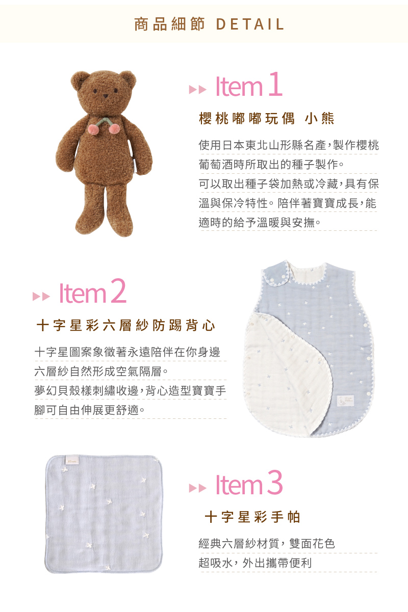 防踢被、手帕:100%棉|櫻桃嘟嘟玩偶:毛絨玩具表布:60% 聚丙烯、40% 棉 / 填充物:100% 聚酯纖維 / 種子袋襯裡:100% 棉、內容物:櫻桃核