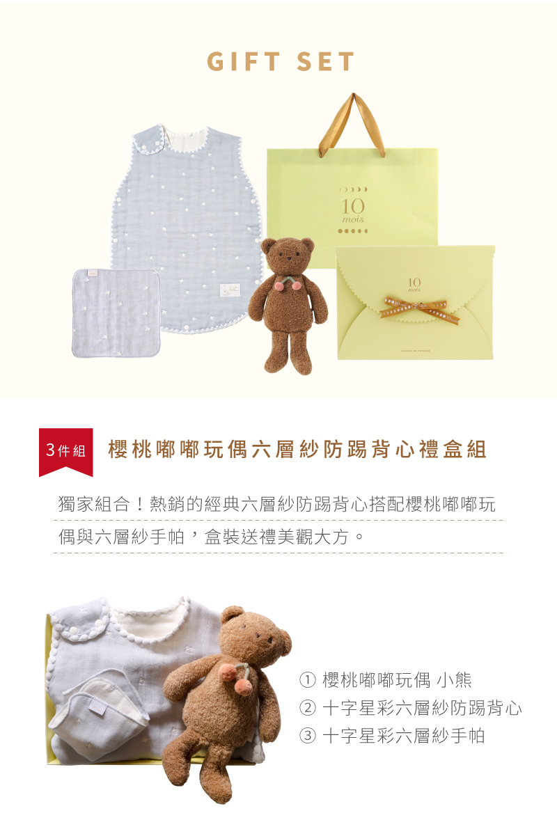 櫻桃嘟嘟玩偶六層紗防踢背心禮盒組 嬰童藍