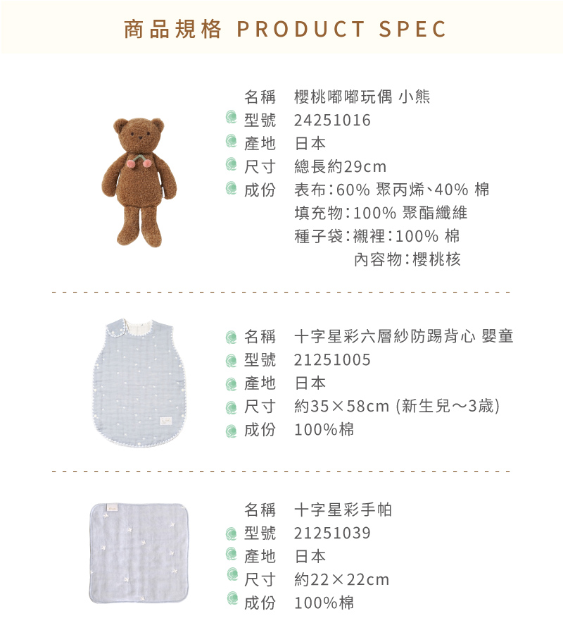 防踢被:約35×58cm (新生兒〜3歳)|櫻桃嘟嘟玩偶:總長約29cm|手帕:22x22cm