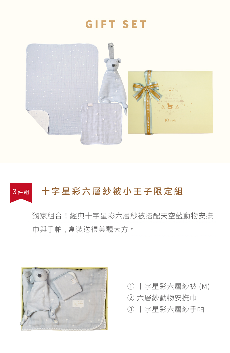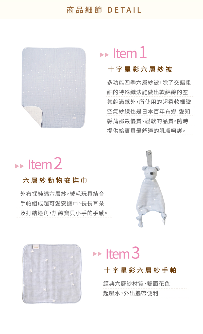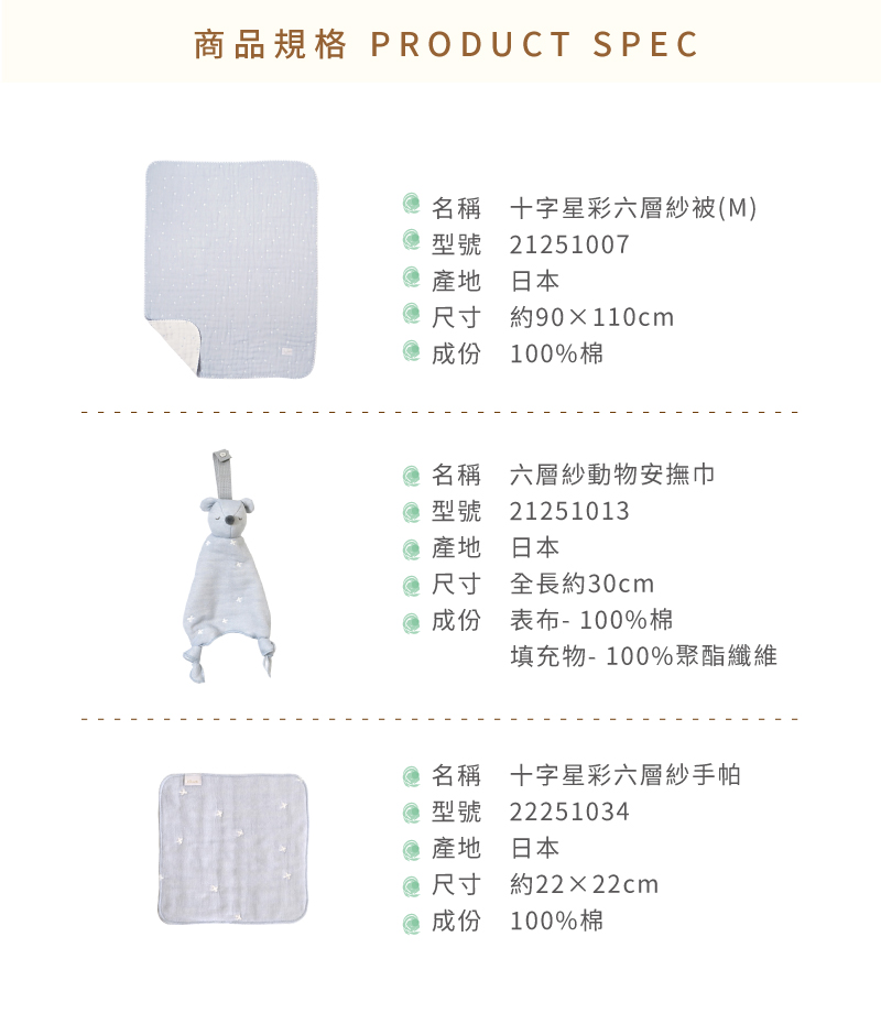 六層紗被:約90×110cm|動物安撫巾:全長約30cm|手帕:約22×22cm