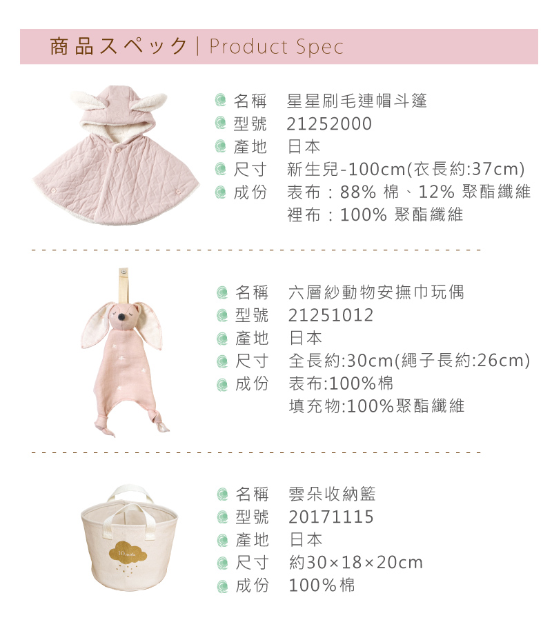 斗篷:表布:88% 棉、12% 聚酯纖維 裡布:100% 聚酯纖維|安撫玩偶:表布:100%棉(部份有機棉)、填充物:100%聚酯纖維