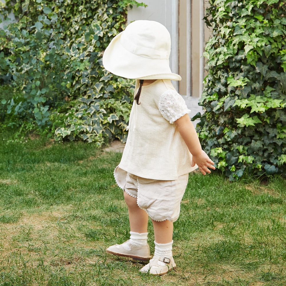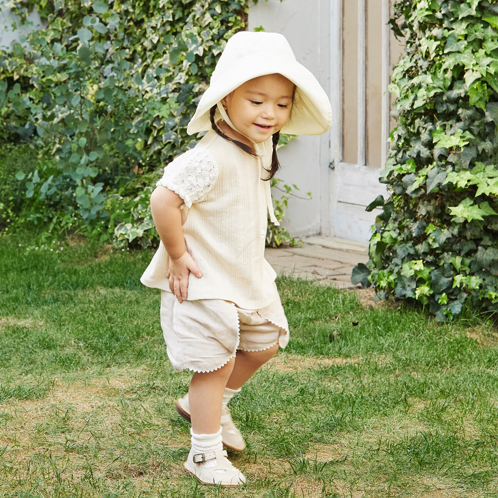 | 大帽緣遮陽帽,可反折設計。 寬帽原設計,清爽的棉麻材質,並在頭圍處繫上一條絲帶並暗藏鈕扣。 由於帽沿很大,可以用前面的鈕扣將帽緣別起,這樣就不易遮住視線。 有象牙色和海軍藍兩種顏色可供選擇,易於搭配。 男女皆宜。吸汗性強透氣性佳,是寶貝夏天必備的時尚單品 |