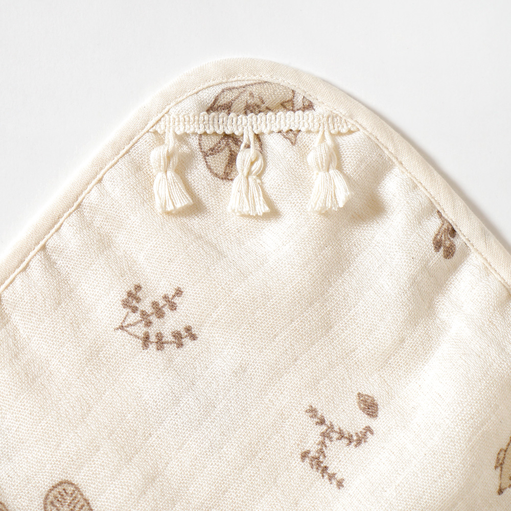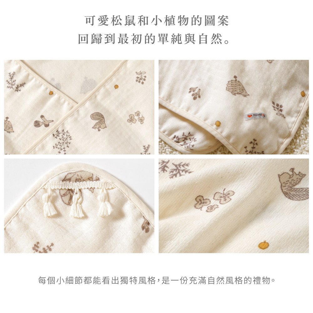 有著可愛松鼠和小植物的圖案,回歸到最初的單純與自然。每個小細節都能看出獨特風格,是一份充滿自然風格的禮物。 將柔軟、透氣、吸水的棉與吸濕、速乾、光滑的天絲相結合,交錯編織成三層紗布 吸水透氣紗布巾,可套頭式方巾設計,非常舒適柔軟可做為新生兒包巾及攜帶小被使用在嬰兒車和兒童汽座上非常方便。 |