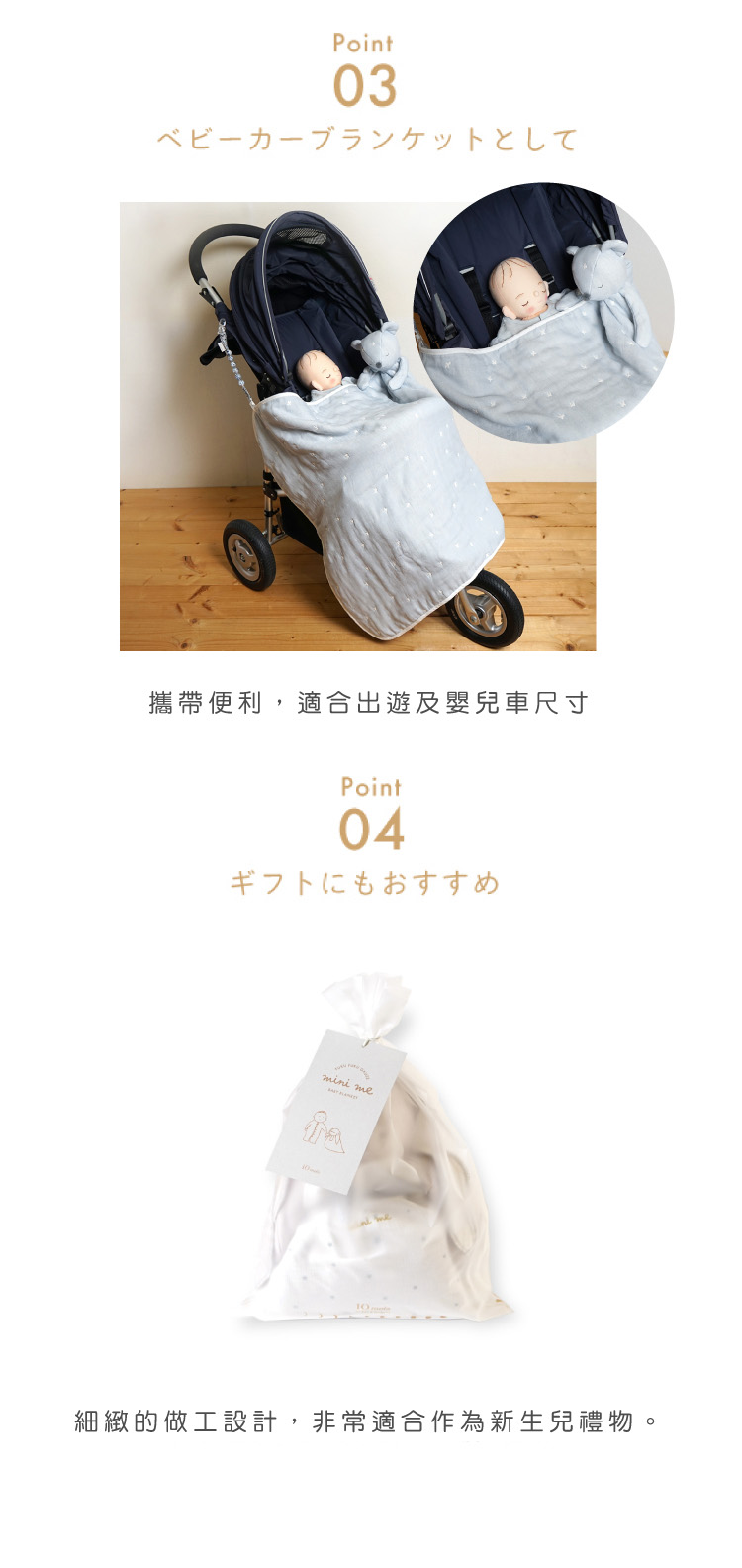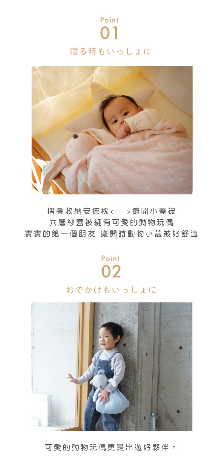 | 細緻的做工設計,非常適合作為新生兒禮物。六層紗蓋被縫有可愛的動物玩偶更是出遊好夥伴。 ▪外出時也可做為哺乳遮巾及推車披巾、小被子等多種功能,一巾多用非常超值 ▪摺疊收納安撫枕<--->攤開小蓋被 ▪攜帶便利:適合出遊及嬰兒車尺寸 ▪清洗便利 柔軟蓬鬆 可愛造型 ▪攤開時動物小蓋被好舒適 「十字星圖案像彷彿小天使般,也像天空中飛翔的小鳥或閃爍的星星。」象徵著永遠陪伴在你身邊。 粉粉嫩嫩的顏色如純真浪漫的櫻花,明度高,暖色調,溫馨明快更顯浪漫。 【mini me】命名為迷你我,希望成為寶寶的第一個朋友,獲得滿滿安全感。 每個寶寶誕生如同一份珍貴的禮物,讓寶寶一出生被愛圍繞,同時期許寶寶成為你自己。 |
