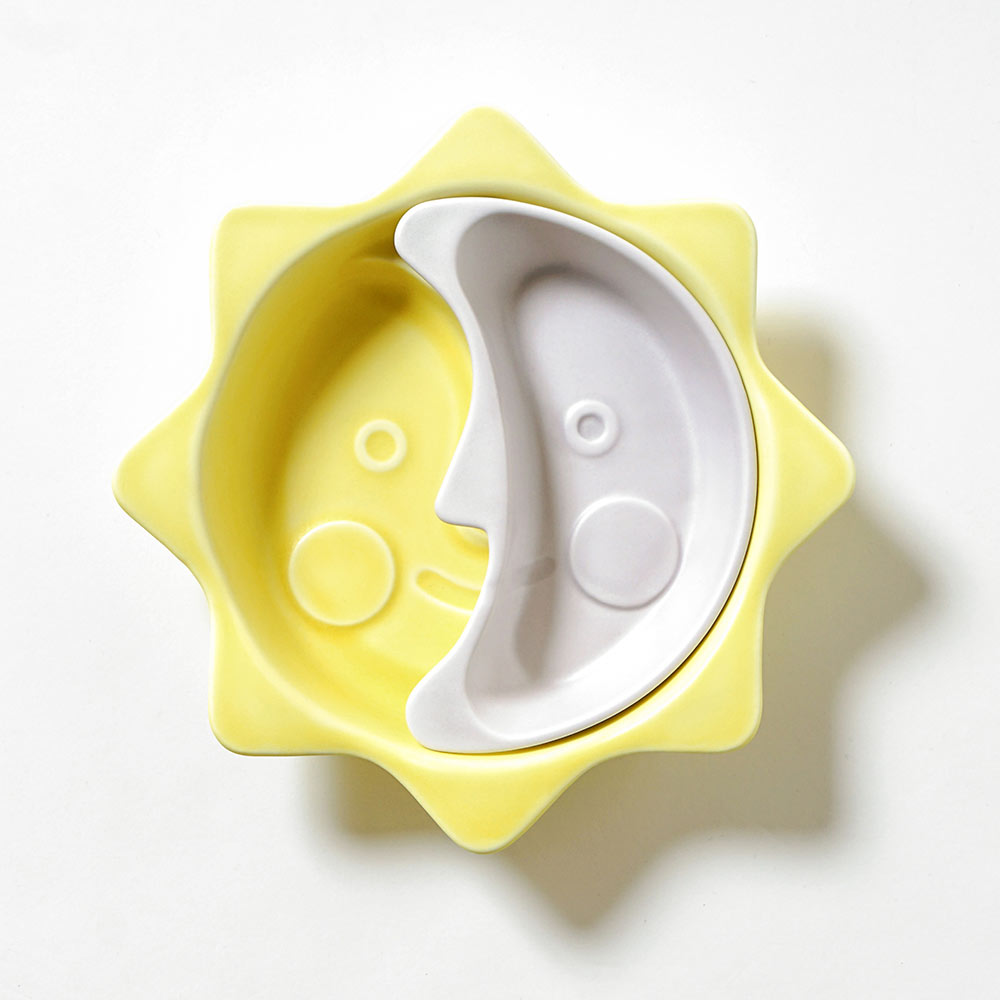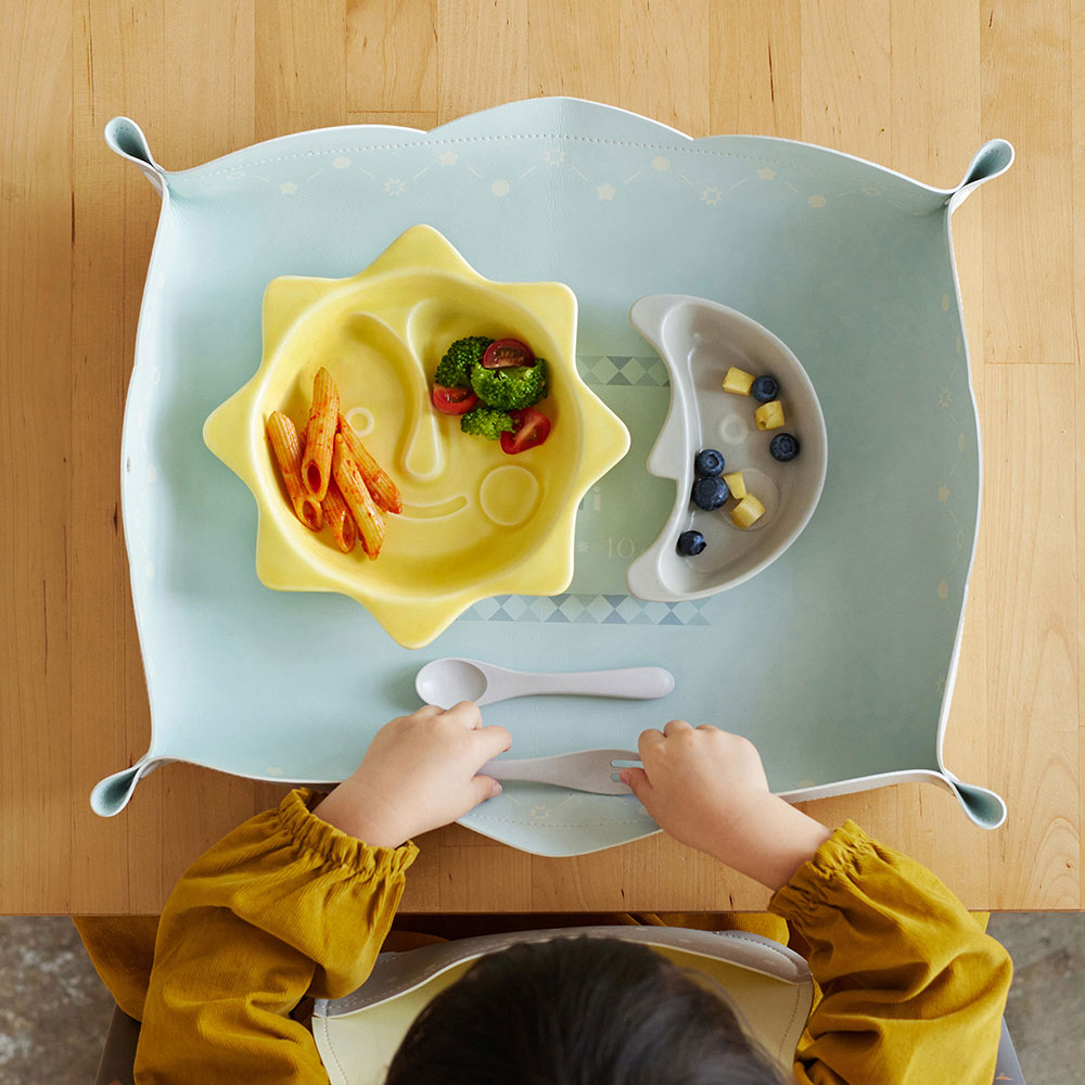 孩子每天使用的餐具,當然要用最安心、最具質感的選擇。採用強化磁器(方石英)材質製成,耐摔、可微波。不僅耐用,更蘊含日本陶瓷文化的溫度。太陽與月亮造型的餐盤設計可愛又實用,還能堆疊收納,節省空間。搭配的叉匙以天然竹粉為原料製成的環保材質,讓用餐更放心。
