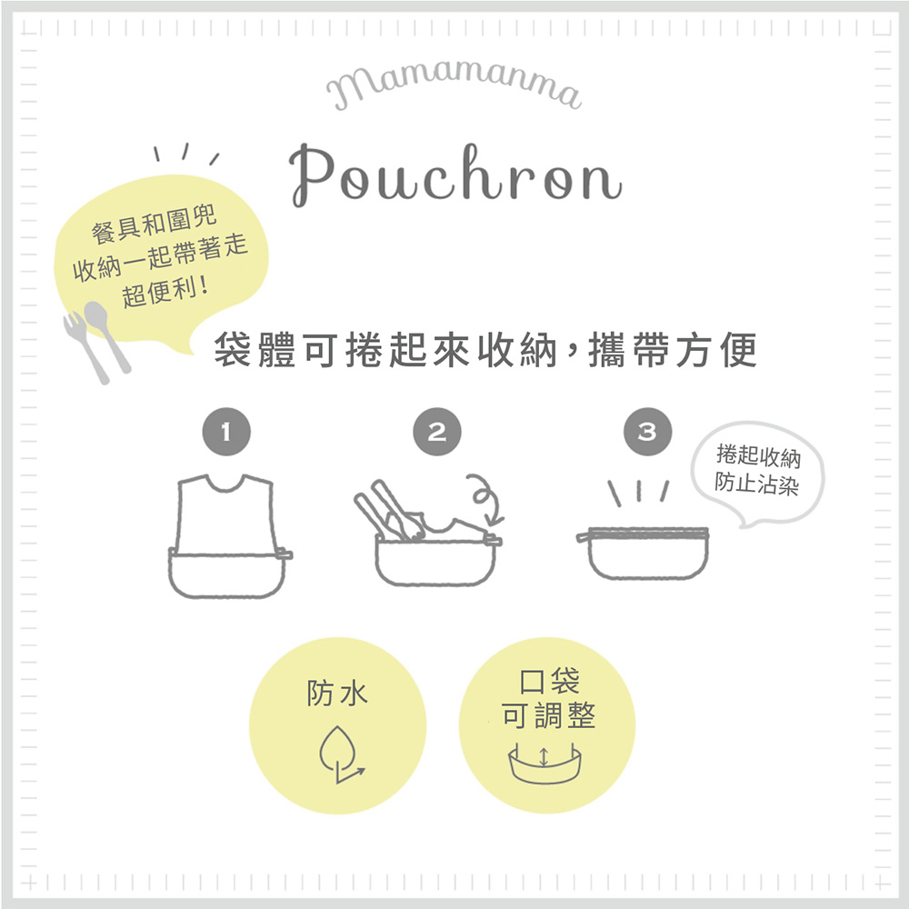 | 兼具功能與便利性的創新設計,讓餐圍兜就像衣服一樣美麗。將餐具整齊收納,方便隨身攜帶,下襬凹槽能接住掉落食物,清理輕鬆不費力。特殊防汙布料設計,髒污輕輕一擦即除,保持潔淨。使用後可捲起收納,節省空間,避免沾染包包或衣物,實用又環保。 |