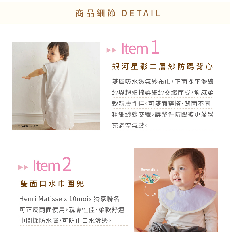 - 一件防踢被 × 一條圍兜 = 四種風格隨意變化
